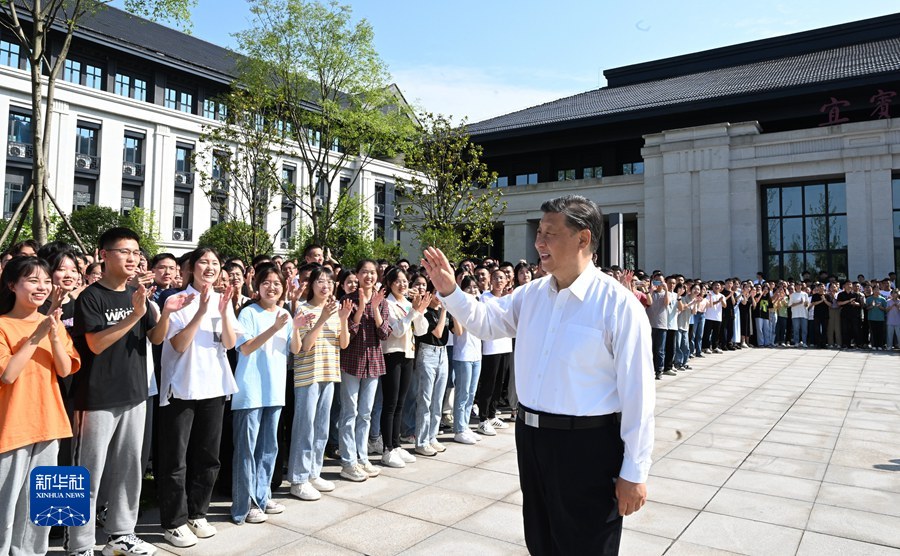 6月8日,中共中央總書記、國家主席、中央軍委主席習近平在四川考察。這是8日下午,習近平在宜賓學院考察時,向師生們揮手致意。新華社記者 謝環馳 攝