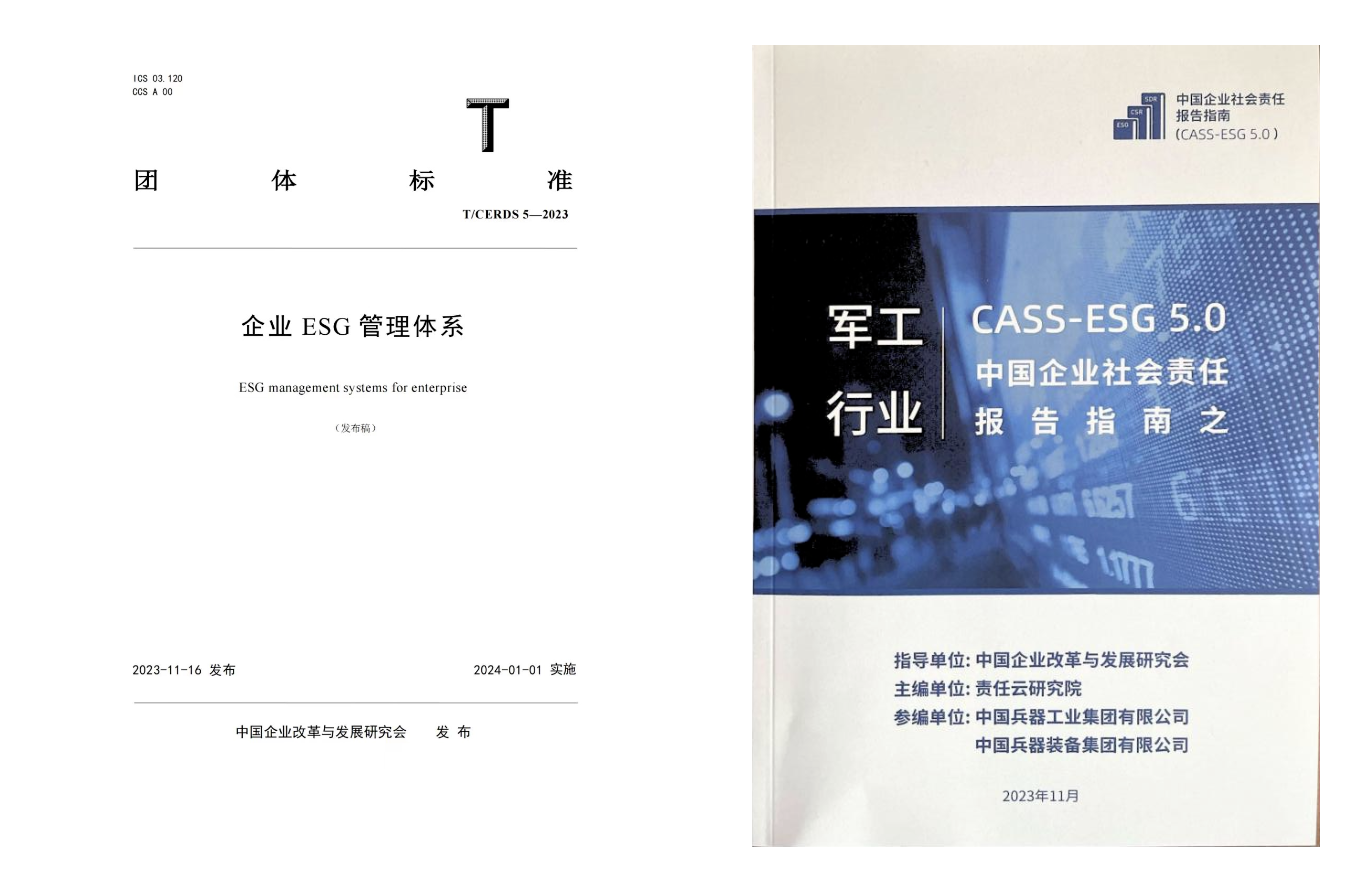 積極參與行業內外社會責任生態建設。積極開展社會責任相關研究。集團公司作為參編單位參與了國務院國資委組織中國質量協會開展的《企業ESG評價指南》《企業ESG管理體系 要求》(團體標準)的編制工作,為ESG工作奠定堅實的基礎。組織兵器規劃院與社科院責任云研究院合作,開展了《軍工集團ESG管理體系研究》課題研究,結合軍工行業特點,搭建軍工集團ESG管理模型和指標體系。為提升對上市公司ESG報告編制的指導性,編制《集團公司ESG報告指南(2023)》(上市公司),為上市公司ESG報告編制提供全過程支撐。在“首屆中國上市公司可持續發展大會”上,中國企業改革發展研究會發布了集團公司起草參編的《企業ESG管理體系》(T/CERDS5—2023)團體標準,在“2023中國企業社會責任報告峰會”上,正式發布了由集團公司參編支持的《中國企業社會責任報告指南(CASS-ESG5.0)之軍工行業》。
